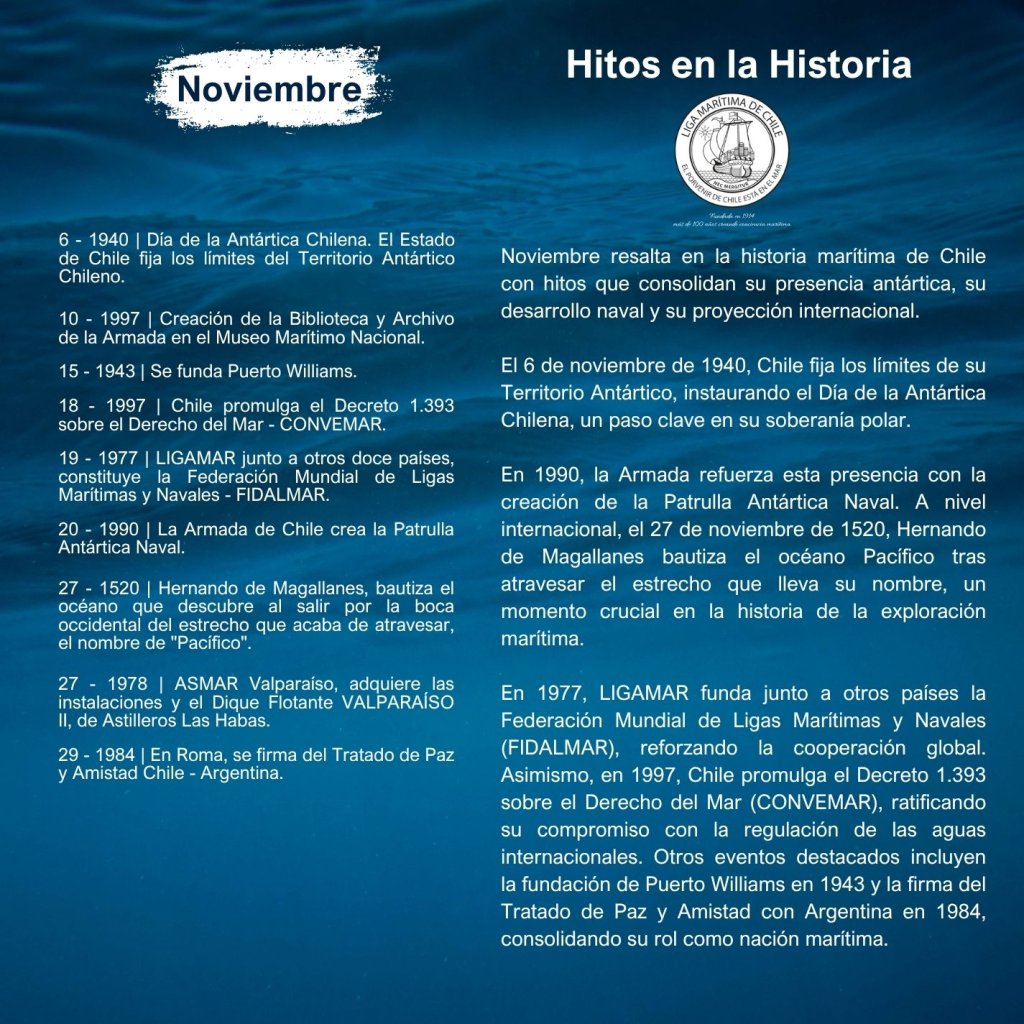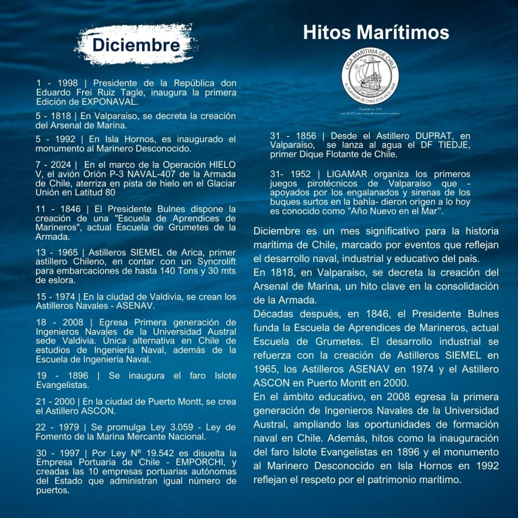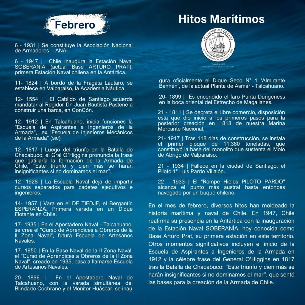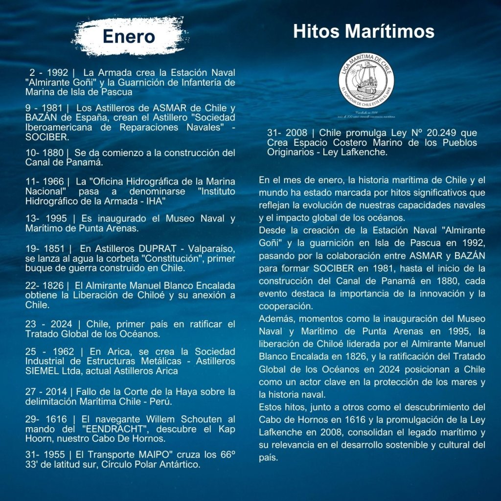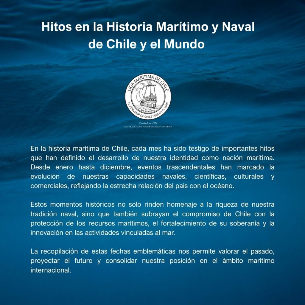 En la historia marítima de Chile, cada mes ha sido testigo de importantes hitos que han definido el desarrollo de nuestra identidad como nación marítima. Desde enero hasta diciembre, eventos trascendentales han marcado la evolución de nuestras capacidades navales, científicas, culturales y comerciales, reflejando la estrecha relación del país con el océano.