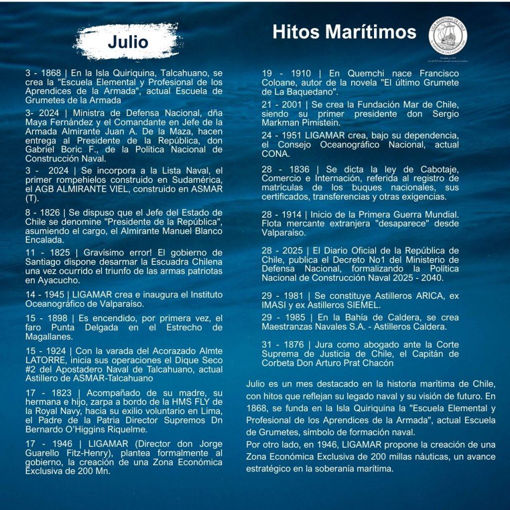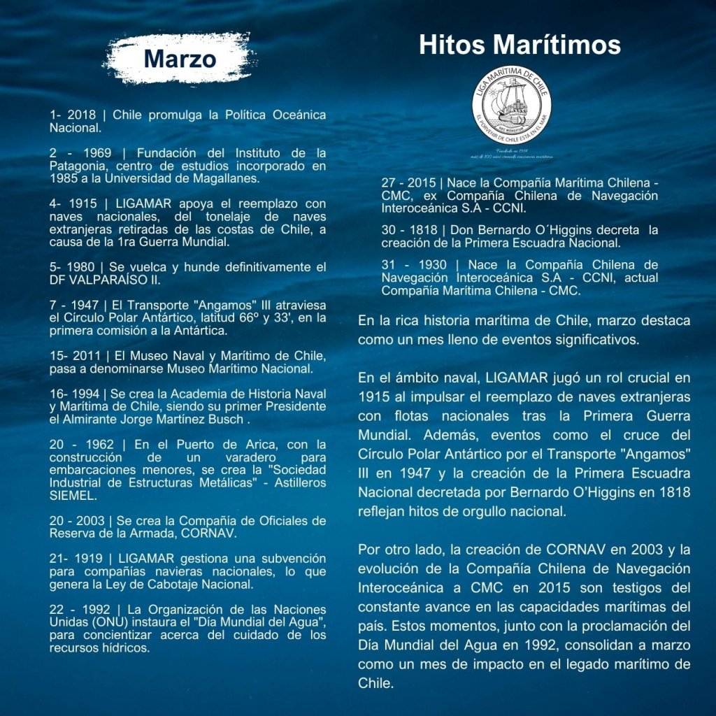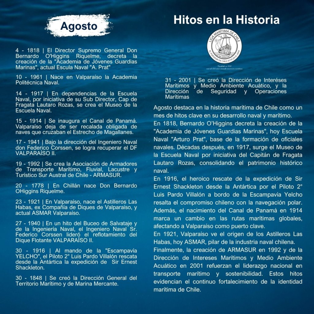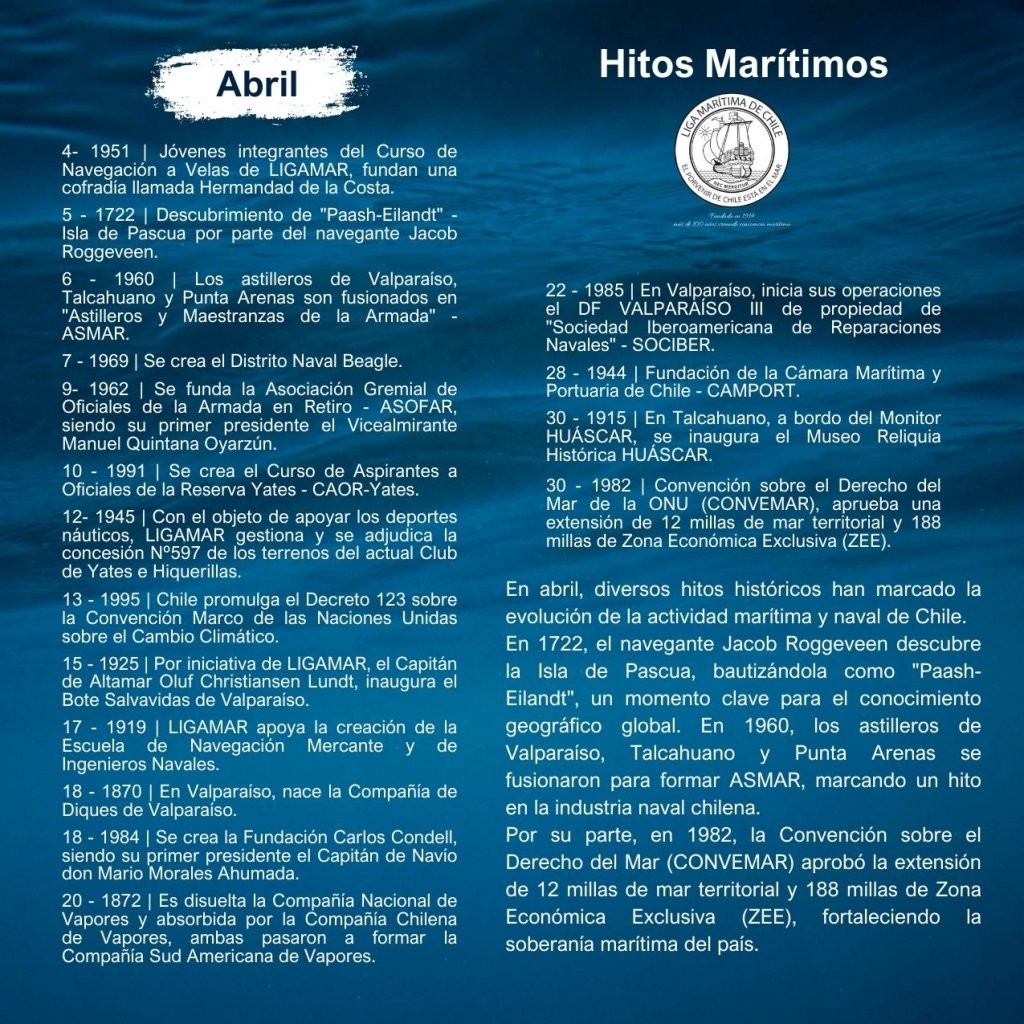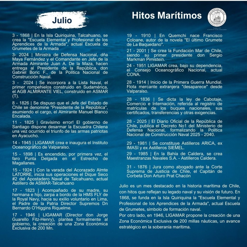 En la historia marítima de Chile, cada mes ha sido testigo de importantes hitos que han definido el desarrollo de nuestra identidad como nación marítima. Desde enero hasta diciembre, eventos trascendentales han marcado la evolución de nuestras capacidades navales, científicas, culturales y comerciales, reflejando la estrecha relación del país con el océano.