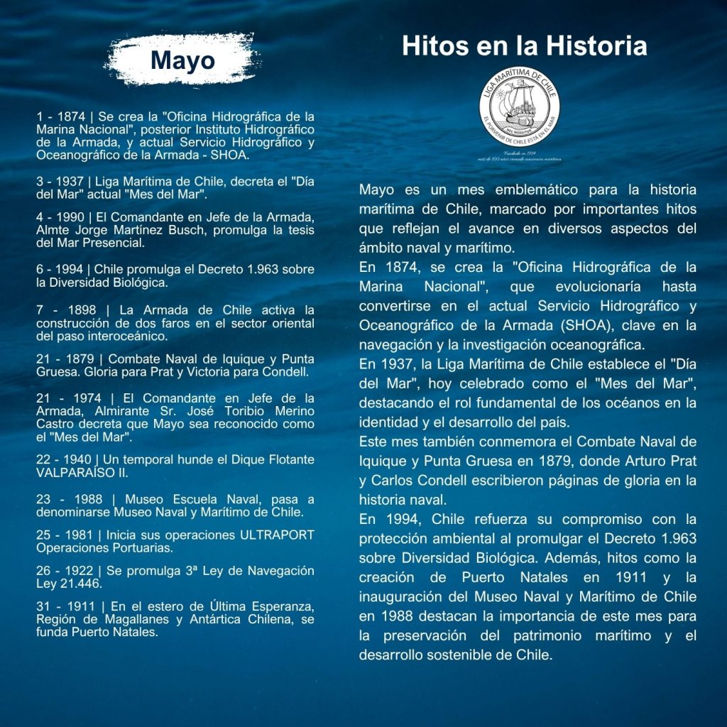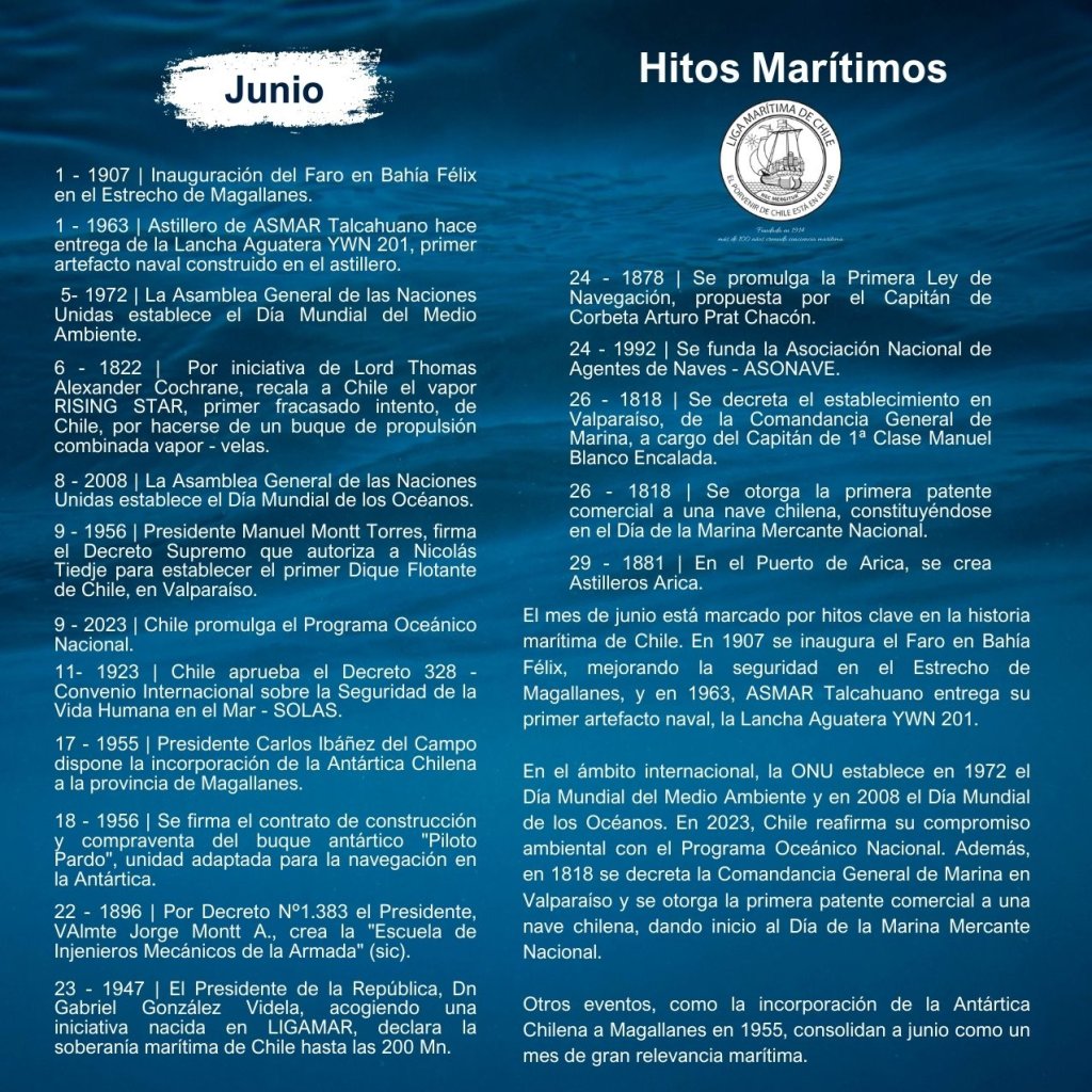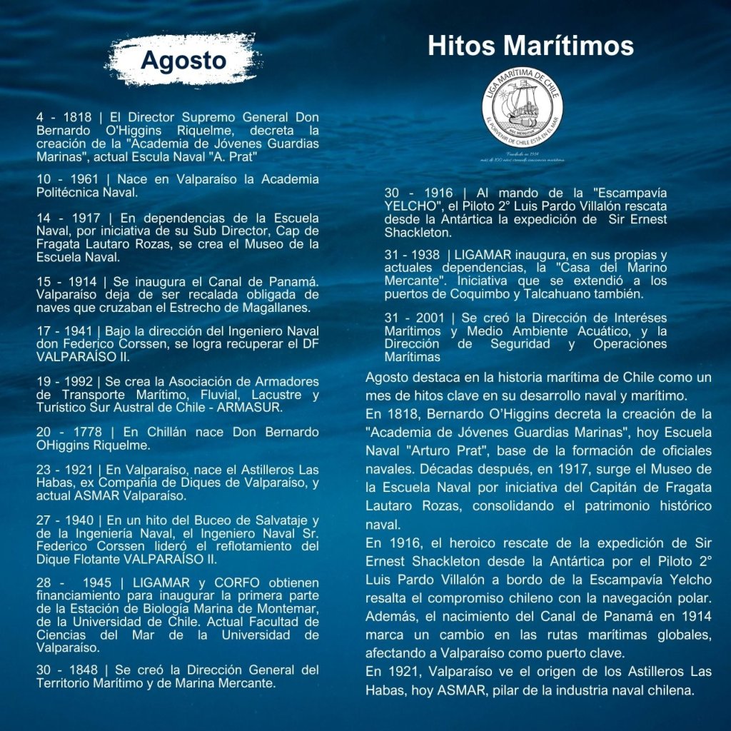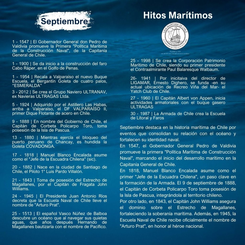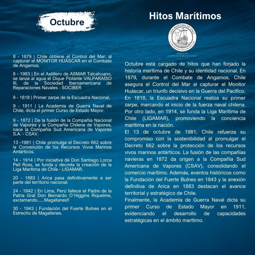 En la historia marítima de Chile, cada mes ha sido testigo de importantes hitos que han definido el desarrollo de nuestra identidad como nación marítima. Desde enero hasta diciembre, eventos trascendentales han marcado la evolución de nuestras capacidades navales, científicas, culturales y comerciales, reflejando la estrecha relación del país con el océano.